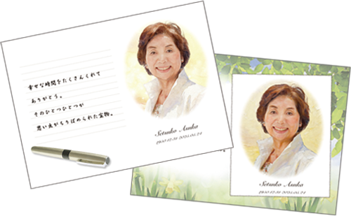 デッサンポートレートボードは肖像画と一緒に故人さまへのメッセージをレイアウトいたします。メッセージは定型文からお選びいただく以外にも、ご希望のメッセージをお入れして作成いたします。