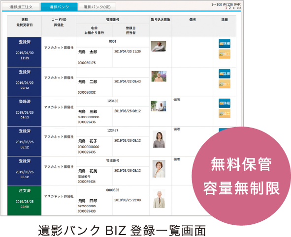 Photo assistから「遺影バンクBIZ」ヘ写真データをアップロードして保管。万が一の際は、ここからご遺影写真をご依頼できます。